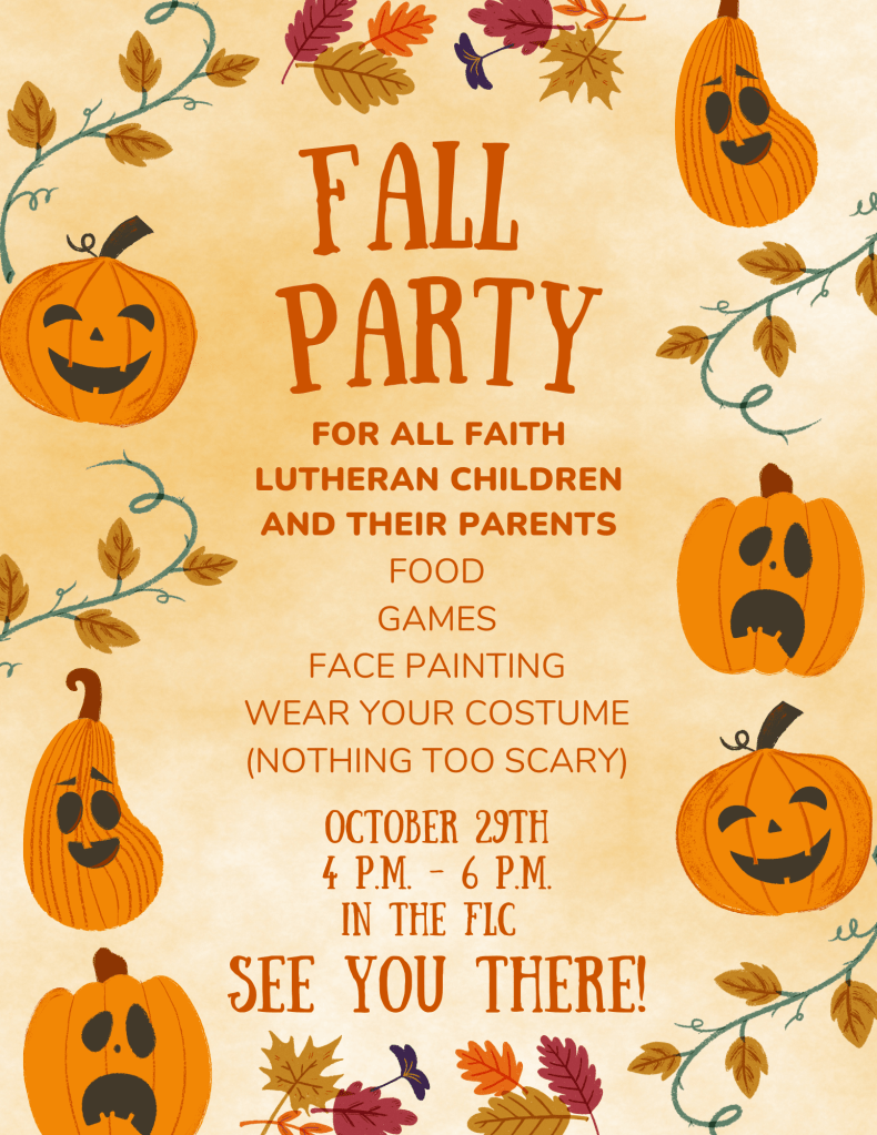 We hope to see you at our Youth Fall Party on October 29th! All children and their parents are invited, and we welcome everyone to wear their Halloween costumes. We will have food, games, and face painting starting at 4:00pm in the Family Life Center.