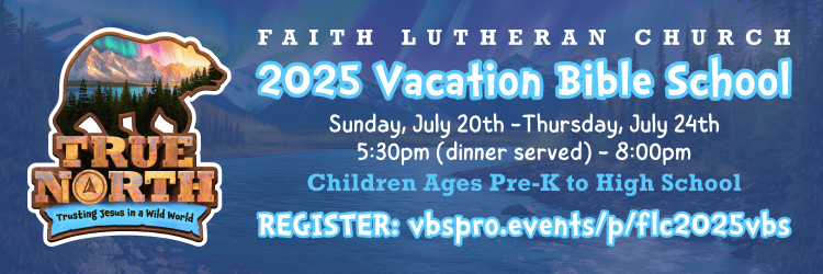 Vacation Bible School returns July 20th-24th at Faith Lutheran Church! The theme for this year is “True North: Trusting Jesus in a Wild World”, where children ages pre-k to high school are invited to join us for the ultimate 5-day Alaskan adventure. True North VBS offers a variety of activities to point kids to Jesus and remind them of His love: catchy songs, team-building games, fun crafts, and awesome Bible-learning experiences kids can see, hear, and touch.