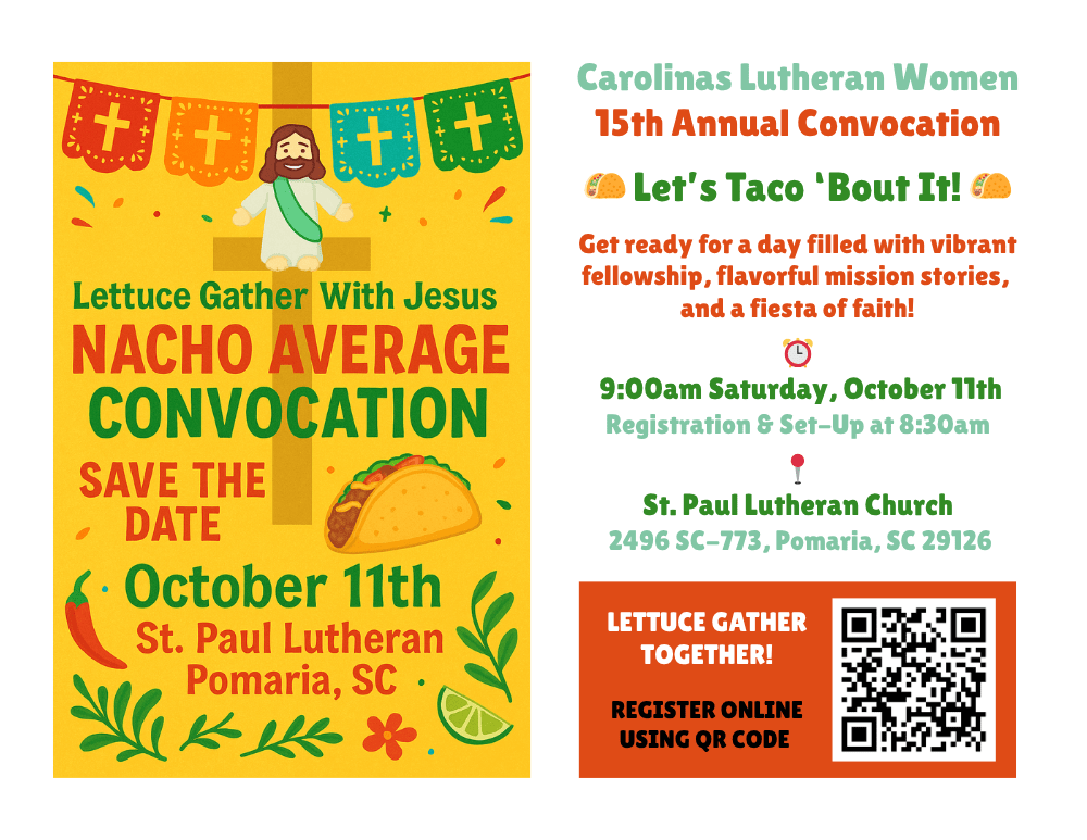 The Carolinas Lutheran Women joyfully invite the Women of Faith to the 15th Annual CLW Convocation—”Lettuce Gather With Jesus for Nacho Average Convocation“! Get ready for a day filled with vibrant fellowship, flavorful mission stories, and a fiesta of faith!